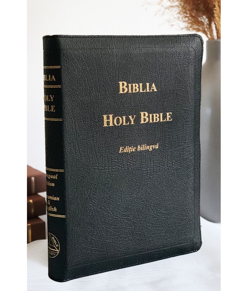 Biblia bilingva engleză-română, marime mare, piele ecologica, visinie, fermoar, index, margini aurii, cuv. lui Isus cu rosu