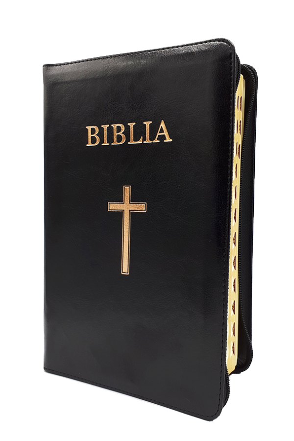 Biblia marime medie, piele ecologica, fermoar, margini aurii, index, simbol cruce, cuv. lui Isus cu rosu