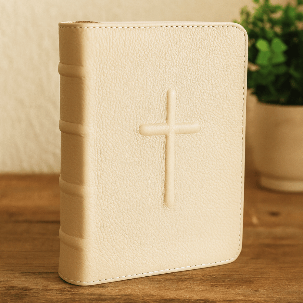 Biblia mica, piele, crem deschis, index, fermoar, margini aurii, simbol cruce in relief, cuv. lui Isus in rosu