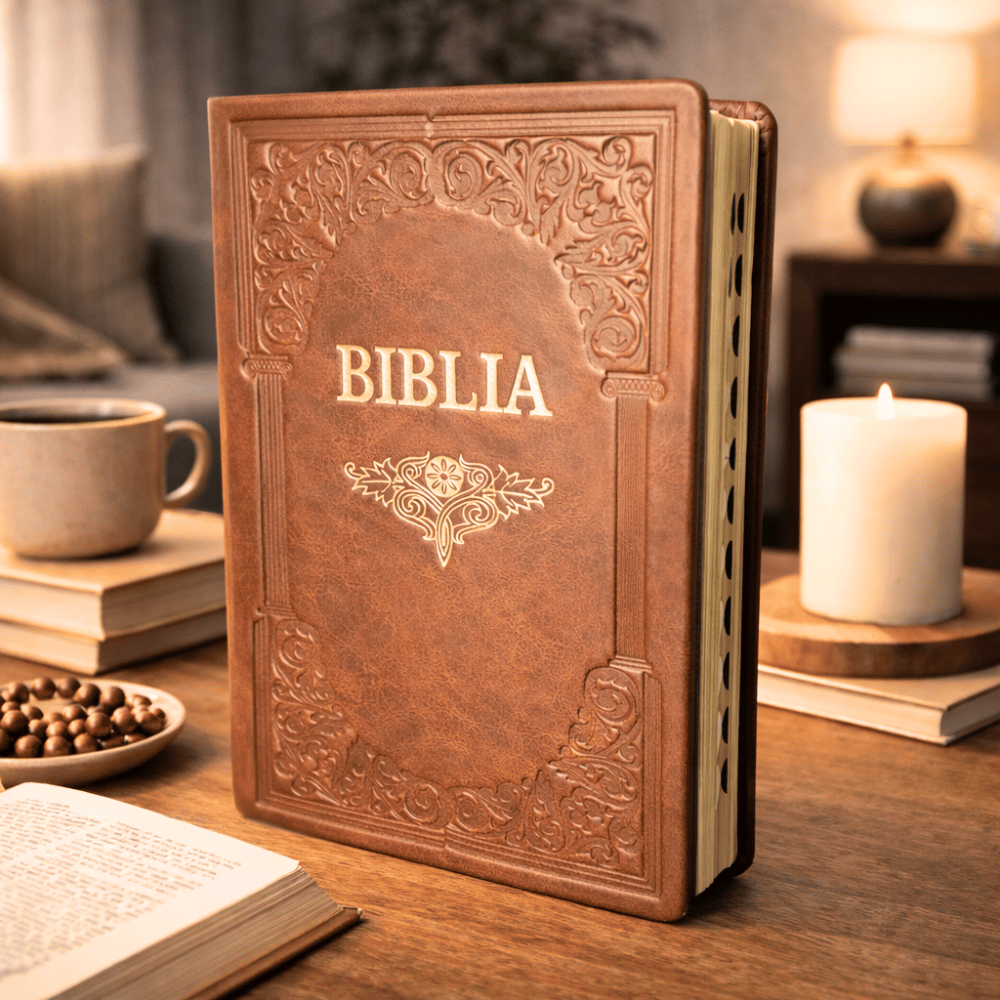 Be the first to review “Biblie mare, piele, handmade, maro, simbol mâini în rugăciune, index, margini aurii, cuv. Isus cu rosu”